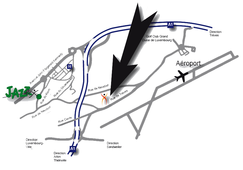 im Findel Business Center 31A, Rue du Kiem Complex C2 , Etage-1, L-1857, Neudorf, Luxembourg Rue de Treves Joelle Roettgers L2632 Findel, Luxemburg. +352 691 152192 Tel: +352-27 848 828 +352 420589 E-mail to: reception@existence.lu joelle@jazzex.lu Parkings: 300 on 1 min. walk across the street, 20 behind the bulding C2 and 10 in front of the building C2. Please respect the parking signs and use you Existence member parking card. BUSSTOP LINE 9, 114 and 117 on 50 meters of entrance. ![]() |